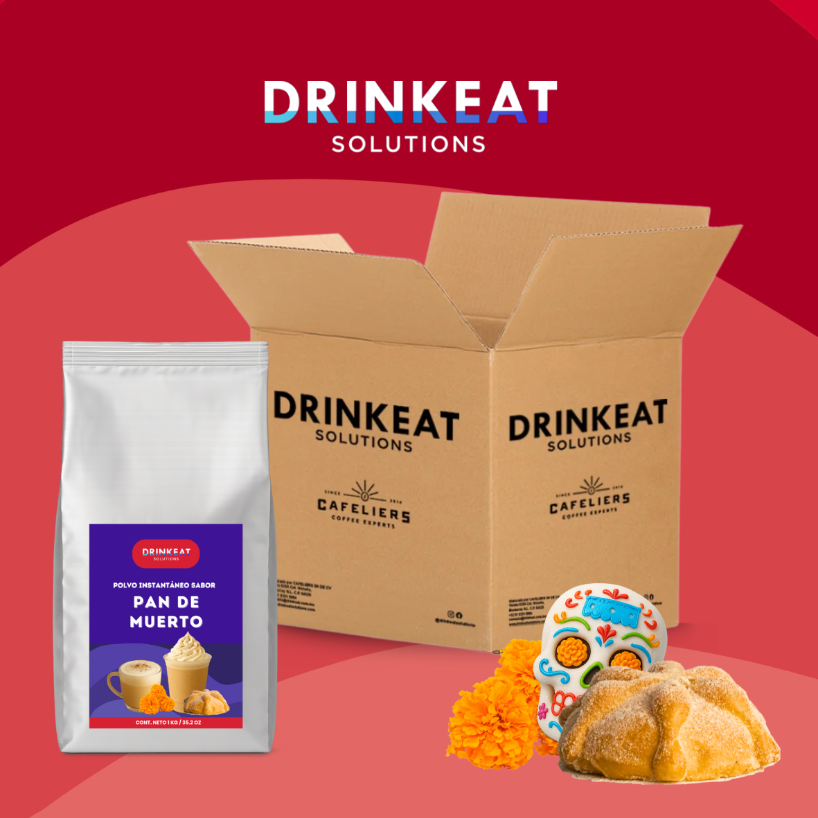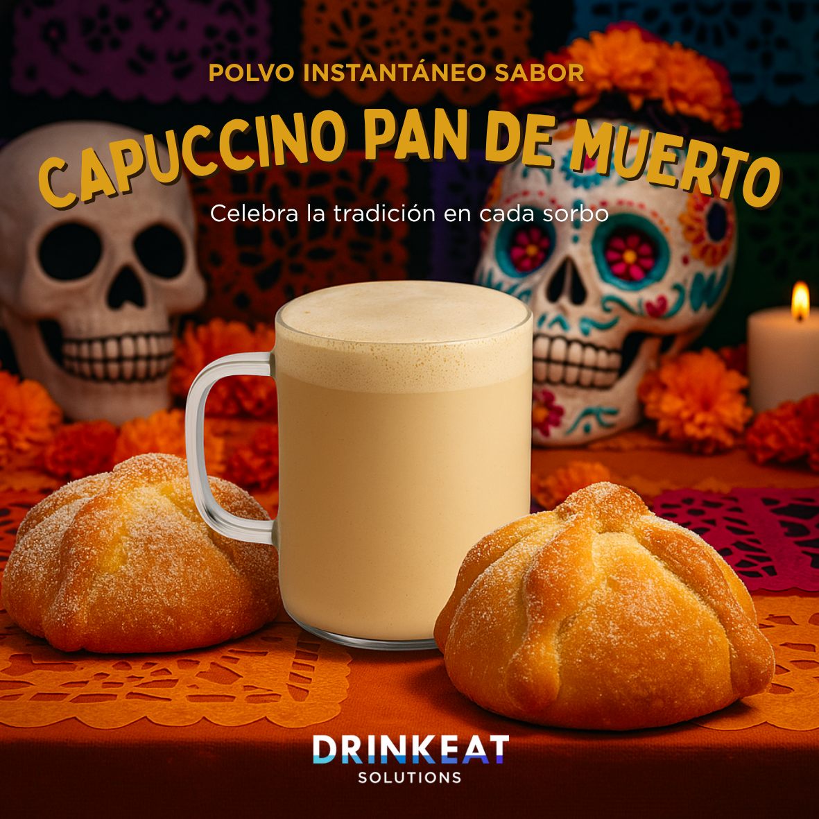 Mezcla en polvo para preparar capuchino instantáneo con el auténtico sabor del pan de muerto. Solo agrega agua caliente y disfruta una bebida cálida y tradicional.